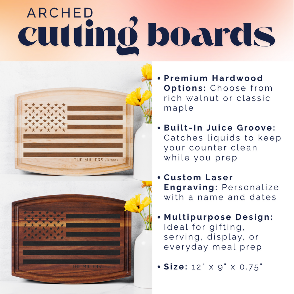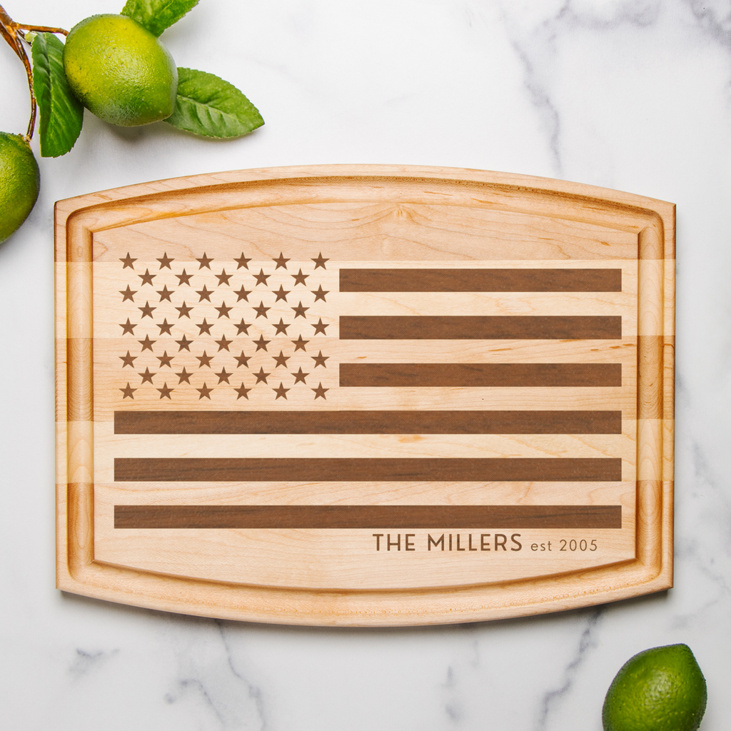 Personalized American Flag Cutting Board – Custom Engraved Wood Board, Patriotic Kitchen Decor, Housewarming or Wedding Gift